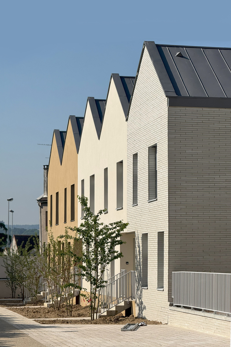 Les façades proposent une ligne de ciel affirmée intégrant toitures en pente et terrasses végétalisées. Elle accompagne les altimétries allant de R+1 à R+4 des différents bâtiments permettant de faire entrer la lumière en cœur d’ilot.