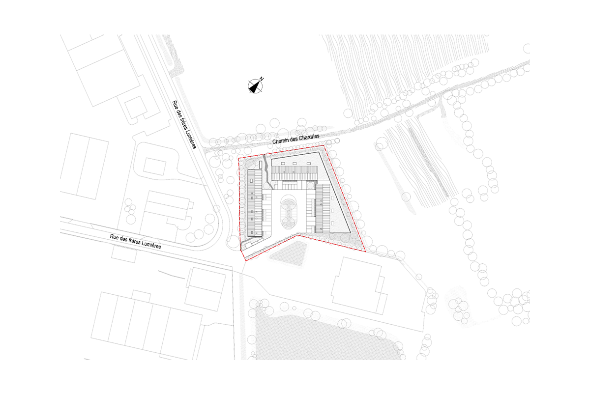 Il s’appuie sur les qualités du site que sont les haies existantes du chemin des Chardries et aussi par la forte présence de la zone humide. Cet environnement naturel constitue la façade de notre projet.